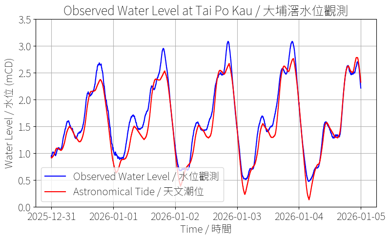 Figure 3: Observed water level (blue line) and the astronomical tide prediction (red line) at Tai Po Kau tide gauge