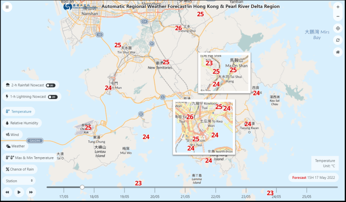 The Hong Kong Observatory launched today (17 May 2022) an enhanced version of the “Automatic Regional Weather Forecast in Hong Kong & Pearl River Delta Region” (ARWF) service with experimental observations and automatic weather forecasts at several newly added urban meteorological monitoring stations.