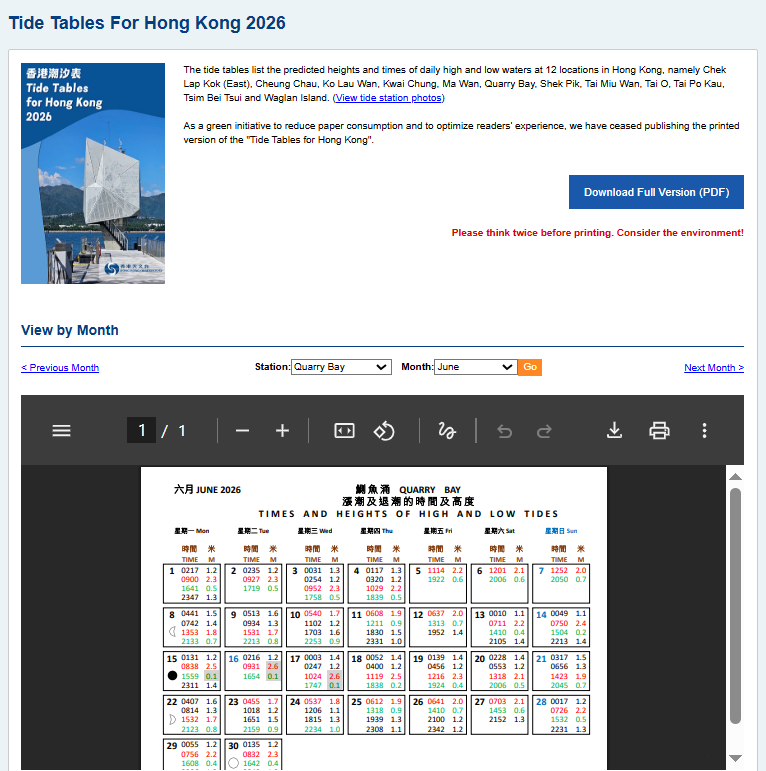 The full version of the “Tide Tables for Hong Kong 2026” in PDF format is now available on the HKO’s website for browsing and download. Tidal information for Hong Kong in graphical form is also available on the “MyObservatory” mobile app.