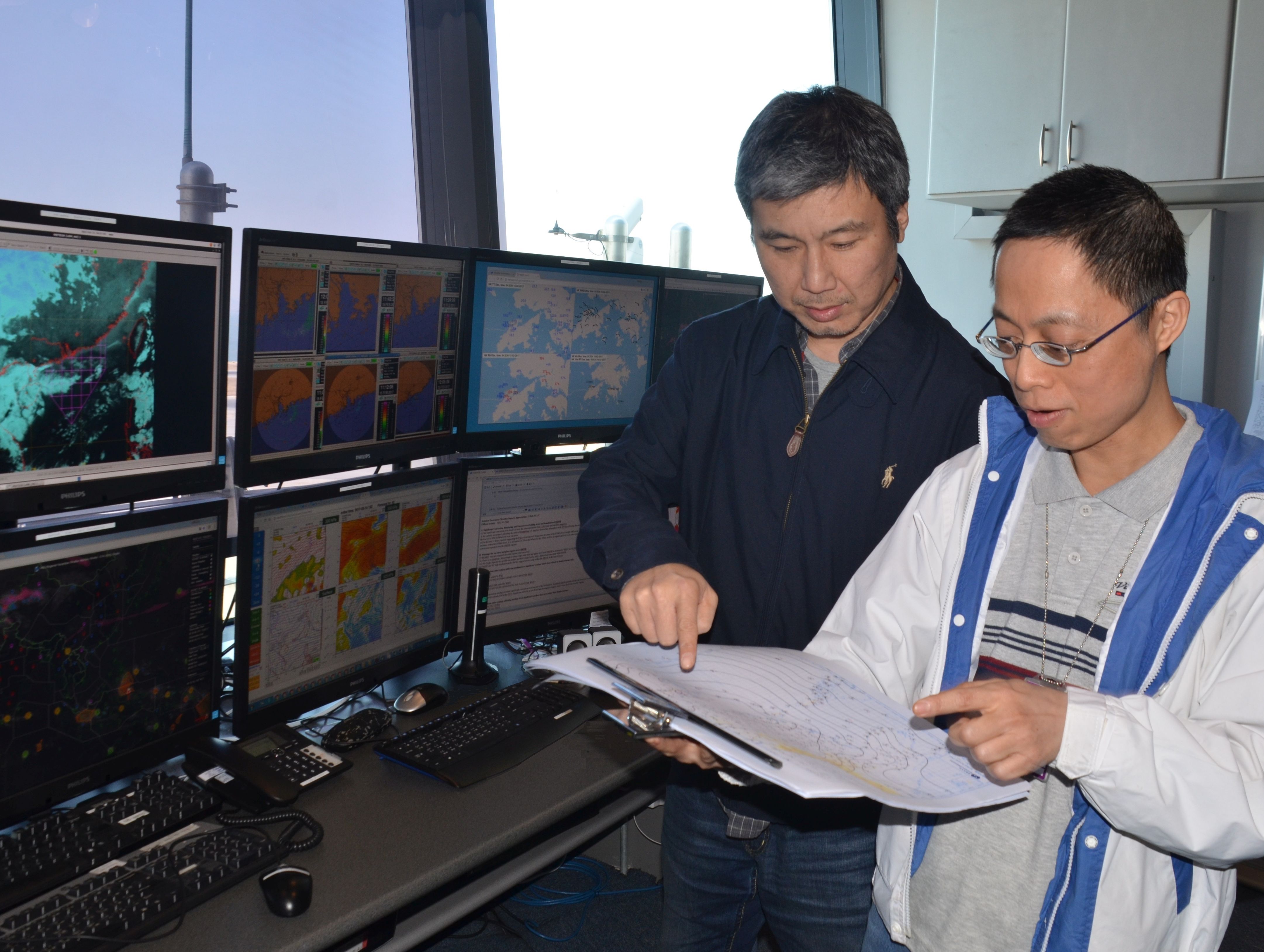 The aviation weather forecaster and assistant aviation weather forecaster are formulating the weather forecasts by studying satellite cloud pictures and outputs of numerical weather prediction models.