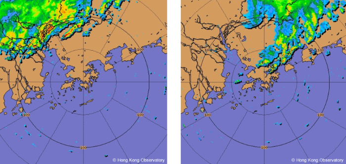 Figure 4 Radar imageries at 7:30 p.m. (left) and 9:30 p.m. (right) on 6 May 2016.