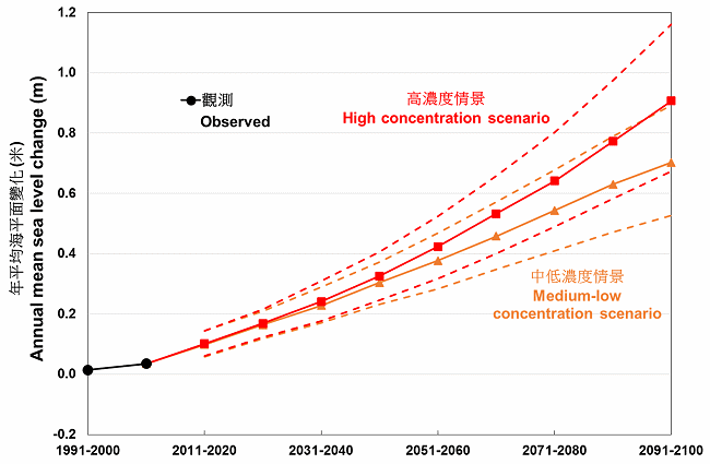 在高(紅色)和中低(橙色)溫室氣體濃度情景下香港及鄰近水域的平均海平面高度變化(相對於1986-2005 年平均)的未來推算(實線是平均值,虛線是推算結果的可能範圍)。歷史觀測以黑線表示。 來源 Source: |