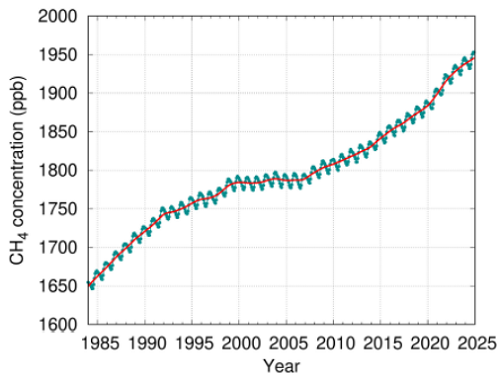 In 2024, the atmospheric concentrations for CO2, CH4 and N2O attained new record highs, reaching 423.9 ppm, 1942 ppb, and 338.0 ppb respectively.