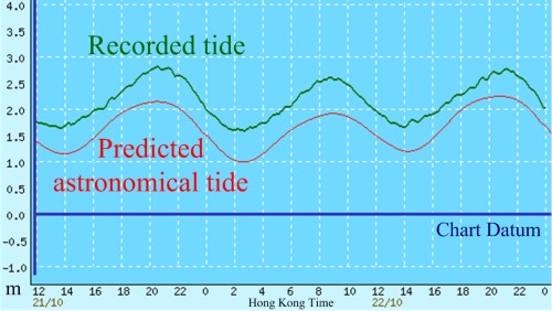 In comparison, Megi's track (Figure 4) was quite different. As it maintained a distance of 400 kilometres from Hong Kong during its passage, the water rose only 0.7 metre locally (Figure 5), of which 0.5 metre was associated with the northeast monsoon prevailing at the time. Thus Megi's storm surge was just 0.2 metre.