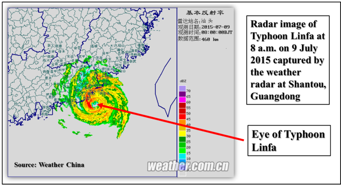 Linfa intensified into a Typhoon at 6am on 9 July. In a collaboration between the Observatory and the Government Flying Service, a fixed-wing aircraft undertook meteorological observations in the vicinity of the eye of Linfa. According to the aircraft data obtained, hurricane force winds (118 kilometres per hour or above) were recorded near the eye of Linfa between 7am and 9am, and gale force winds also extended to about 100 kilometres (Figure 1). At that time, Linfa was expected to move west or west-southwest, coming very close to Hong Kong in the evening and posing a threat to Hong Kong. Just before Linfa make landfall near Lufeng, Guangdong Province, its eye structure remained intact (Figure 2). Based on the available meteorological data at that time and out of prime concern for public safety, the Observatory issued the Pre-No.8 Announcement at 2:40pm on 9 July, and then the No.8 Northwest Gale or Storm Signal at 4:40pm.