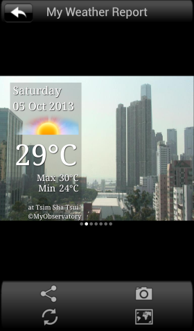 The Hong Kong Observatory (HKO) launched version 3.1 of the mobile app "MyObservatory" today (11 October 2013) on Android platform. The new version features "My Weather Report" (Figure 1) and an enhanced user interface of the "Storm Track" (Figure 2).