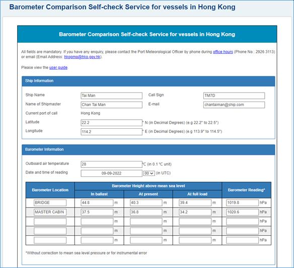 To further enhance this service, a new e-form for Barometer Comparison Self-check Service has been developed for vessels (Figure 1) to facilitate acquiring the correction indexes by the ship crew to calibrate the barometer onboard the ships when berthing at Hong Kong port. The ship crews simply input to the e-form the outboard air pressure and air temperature readings as well as information on the height of the barometer onboard the ship. The correction indexes and total correction (Figure 2) will then be computed automatically for them to adjust the ship barometers and remove the instrumental bias in order to obtain the mean sea level pressure data. The ship crew now can obtain the calibration results at any time without awaiting for the reply by PMO. This new service further streamlines the whole process and enhances the efficiency.