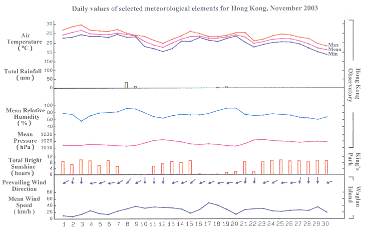 November 2003 was wetter than normal. The monthly rainfall of 50.1 millimetres was some 40 percent above the normal figure of 35.1 millimetres. The accumulated rainfall since the beginning of the year is 1 941.9 millimetres, about 11 per cent below the normal figure of 2 187.0 millimetres for the same period. A broad ridge of high pressure brought sunny weather to Hong Kong in the first six days of November 2003. Under light winds, haze occurred on 2 November. The visibility inside the Victoria Harbour fell to 1800 metres while that at the Hong Kong International Airport dropped to 1000 metres, setting a new record of low visibility for haze in Hong Kong. It was very dry on 3 November and the minimum relative humidity of 31 per cent recorded that morning was the lowest so far this year. With long hours of sunshine during the day, the temperature rose to a maximum of 29.6 degrees on that day, the highest of the month. A moist easterly airstream arrived in the afternoon of 7 November, bringing some light rain patches to Hong Kong. Rain became more frequent the next two days when a cold front approached and passed through the south China coast. The drier air behind the cold front eventually cleared the rain and cloud on 11 November. Under the dominance of the northeast monsoon, cool and dry weather continued for a few days. There were reports of haze on 15 November in light wind conditions. When Nepartak entered the South China Sea on 14 November, it intensified into a severe tropical storm and moved in the general direction of Hainan. The rainbands associated with Nepartak drifted towards the south China coast on 16 November, bringing rain to Hong Kong in the ensuing four days. Another cold front crossed the coast of South China on 21 November and brought cooler weather to Hong Kong. A trace of rainfall was recorded the next day but the clouds associated with the cold front dispersed quickly on 23 November. The continental airstream behind the cold front maintained generally fine and dry conditions in Hong Kong throughout the rest of the month. Under light winds, it was hazy from 24 to 27 November. With a replenishment of the northeast monsoon, the temperature fell to 13.9 degrees on the morning of 30 November, the lowest recorded so far this winter. A total of 3 tropical cyclones occurred in the western North Pacific and the South China Sea in the month. Details of issuance and cancellation of various warnings/signals in the month are summarized in Tables 1.1 to 1.3. Monthly meteorological figures and departures from normal for November are tabulated in Table 2. |