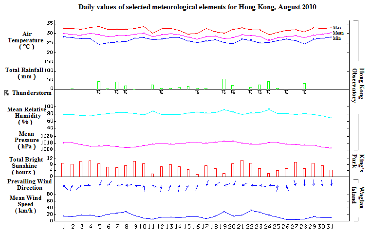 Dominated by a relatively strong Pacific ridge, August 2010 was hotter and sunnier than usual. The mean temperature for the month was 28.8 degrees, about 0.4 degrees above normal. Meanwhile, the total bright sunshine duration for the month was 213.4 hours, about 12 percent above normal. The month was also drier than usual. The total rainfall in the month was 350.3 millimetres, about 21 percent below the normal figure of 444.6 millimetres. The accumulated rainfall since 1 January was 1705.3 millimetres, about 9 percent below the normal figure of 1873.7 millimetres for the same period.