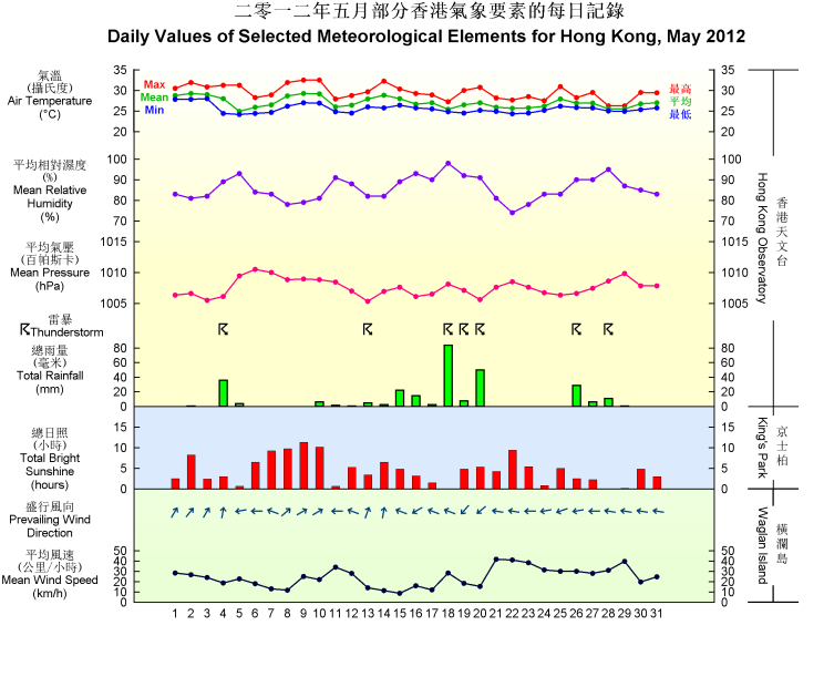 May 2012 was warmer than usual. The mean temperature of the month was 27.0 degrees, 1.1 degrees above the normal figure of 25.9 degrees. The early part of the month was exceptionally warm. With the prevalence of warm maritime airstream together with abundant sunshine, the mean temperature rose to 27.7 degrees during 1 to 15 May and tied with that of 1977 as the highest in the first half of May since record began. Moreover, the lowest temperature of the month as recorded on 5 May was 24.1 degrees, the highest absolute minimum temperature for May on record.