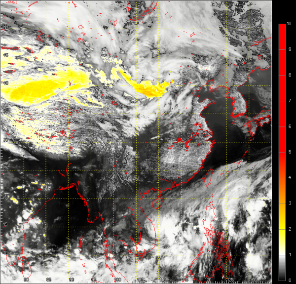 Post-processed satellite image at 20HKT on 10 November 2010 showing possible regions (highlighted in yellow to red colours) over northern China which were affected by sand and dust weather.