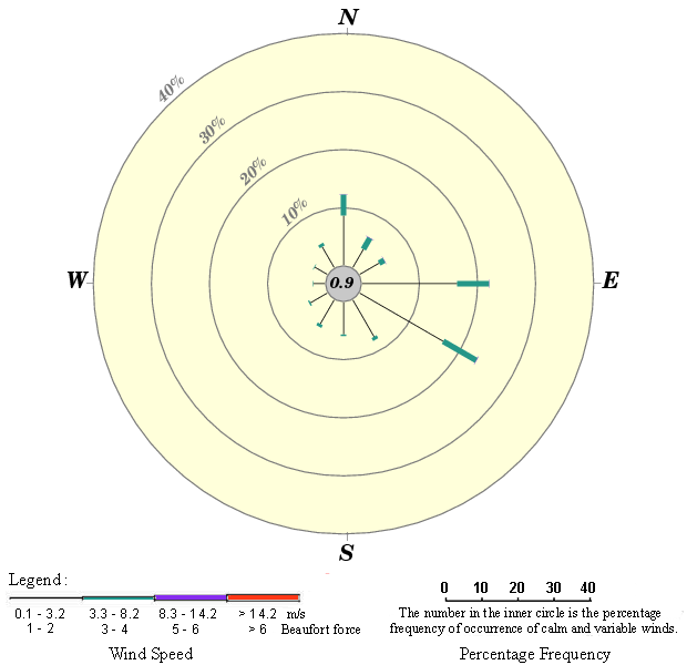 The Ta Kwu Ling wind station is located inside the Ta Kwu Ling Farm at the northern part of the New Territories (please see the map below for the location of the wind station). The station has rather good exposure as there are no high-rise buildings in its vicinity, and the high mountains are mostly located quite far away. The station is generally well-exposed to winds from all directions. The prevailing winds of the station are in general east to southeasterlies, as revealed in the annual wind rose for the station.