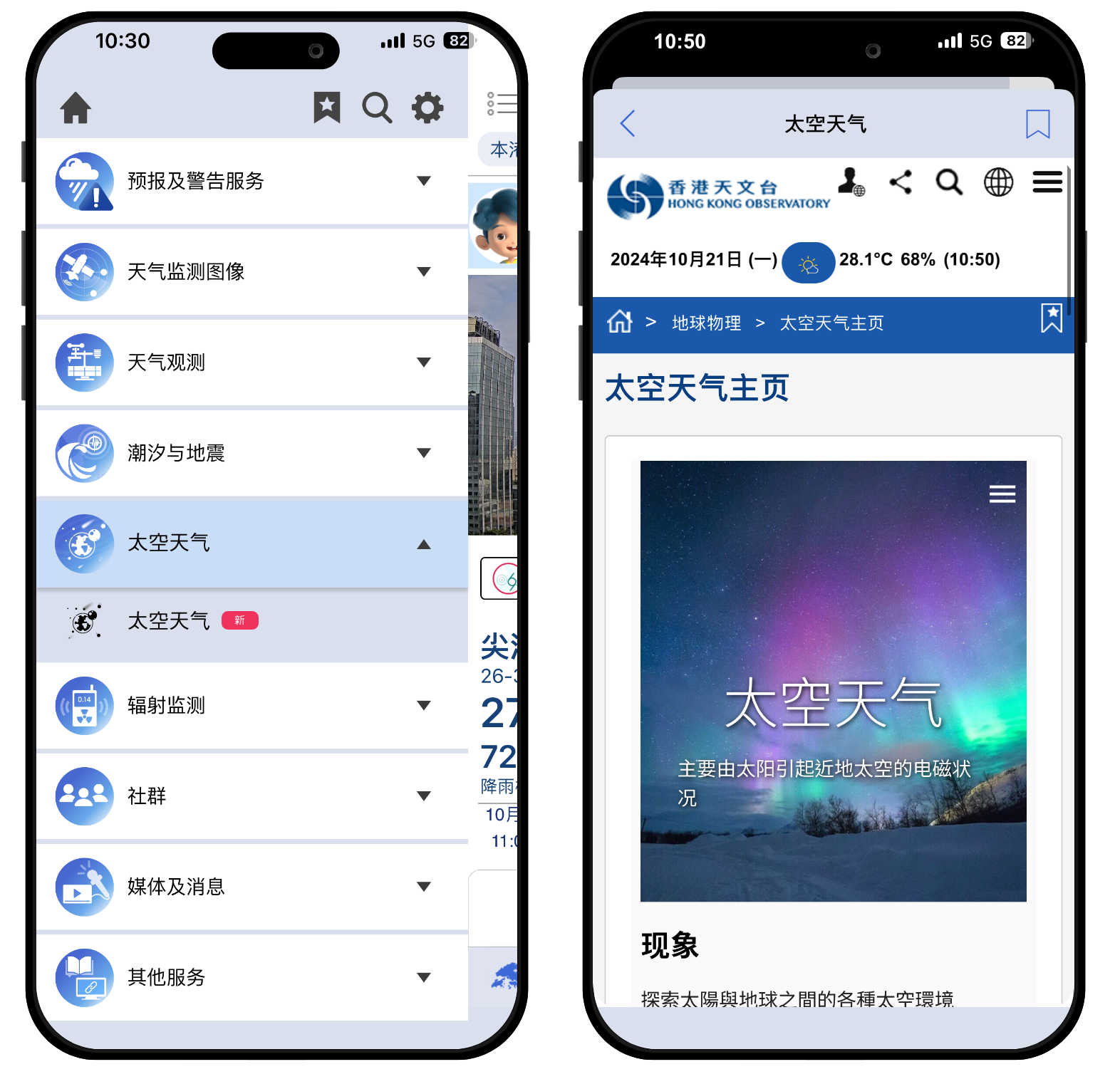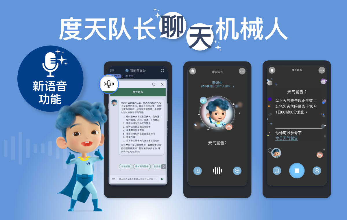 为了让市民更方便获取天气、天文和气候相关的资讯,天文台于11月21日 推出新版本的「我的天文台」(iOS版本7.8, Android版本5.10),新版本内的「度天队长」聊天机械人新增了试验版语音功能(图一)。除了透过输入文字的方式之外,用户现时更可以在全新页面以语音方式和「度天队长」进行互动,更方便快捷地获取最新天气消息。同时,用户亦可透过以上新版本「我的天文台」(华为版本5.10),获取有关太空天气的资讯(图二)。