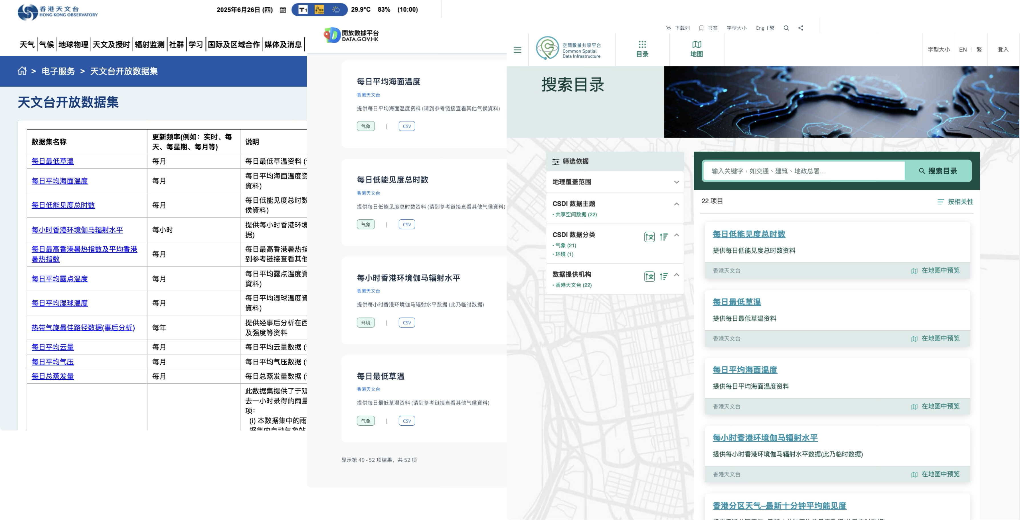 2012年起,香港天文台已在网站上以机器可读格式发布天气数据。这些数据均可在「开放数据平台」(DATA.GOV.HK)及「空间数据共享平台」(PORTAL.CSDI.GOV.HK)上获取。为了开放更多数据供公众免费使用,天文台今日(20256月26日)发布了4个新数据集: