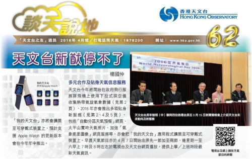 - 中国民用航空管理局人员到访天文台.地震专家及学者参加「第七届粤港澳地区地震科技研讨会」.与渔护署同事在中学合作主持气候变化讲座.香港滑浪风帆会教练及运动员到天文台参加天气课程.职员会到湖南省参观郴州国家基本气象站.天文台科学顾问到访天文台并主持讲座.一众同事为总科学助理屈锦城先生举办荣休派对