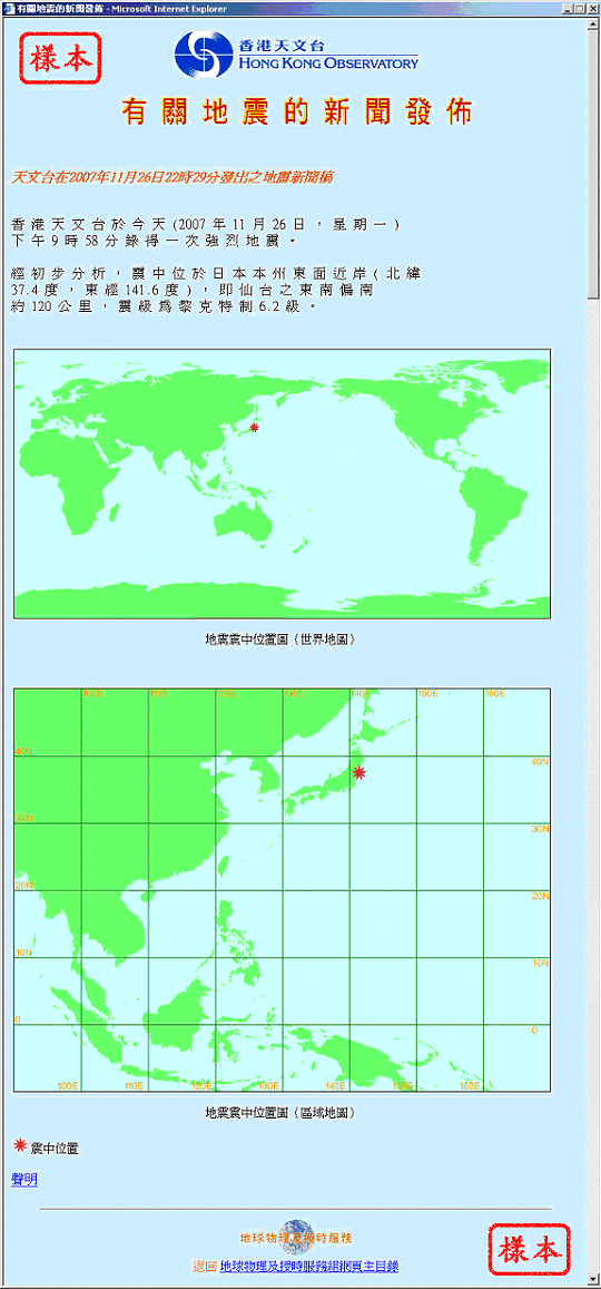 为加强地震新闻服务,天文台今日(2007年12月19日)起在 地震新闻网页 内增设地图,以显示地震震中的位置。 天文台以往发出的地震新闻稿以文字表达地震的震中位置。在新的网上地震新闻网页中,震中位置会以红色星状符号标示在世界地图及区域地图上(请参考下列网页样本),有助市民更好掌握地震发生的确实地理位置。