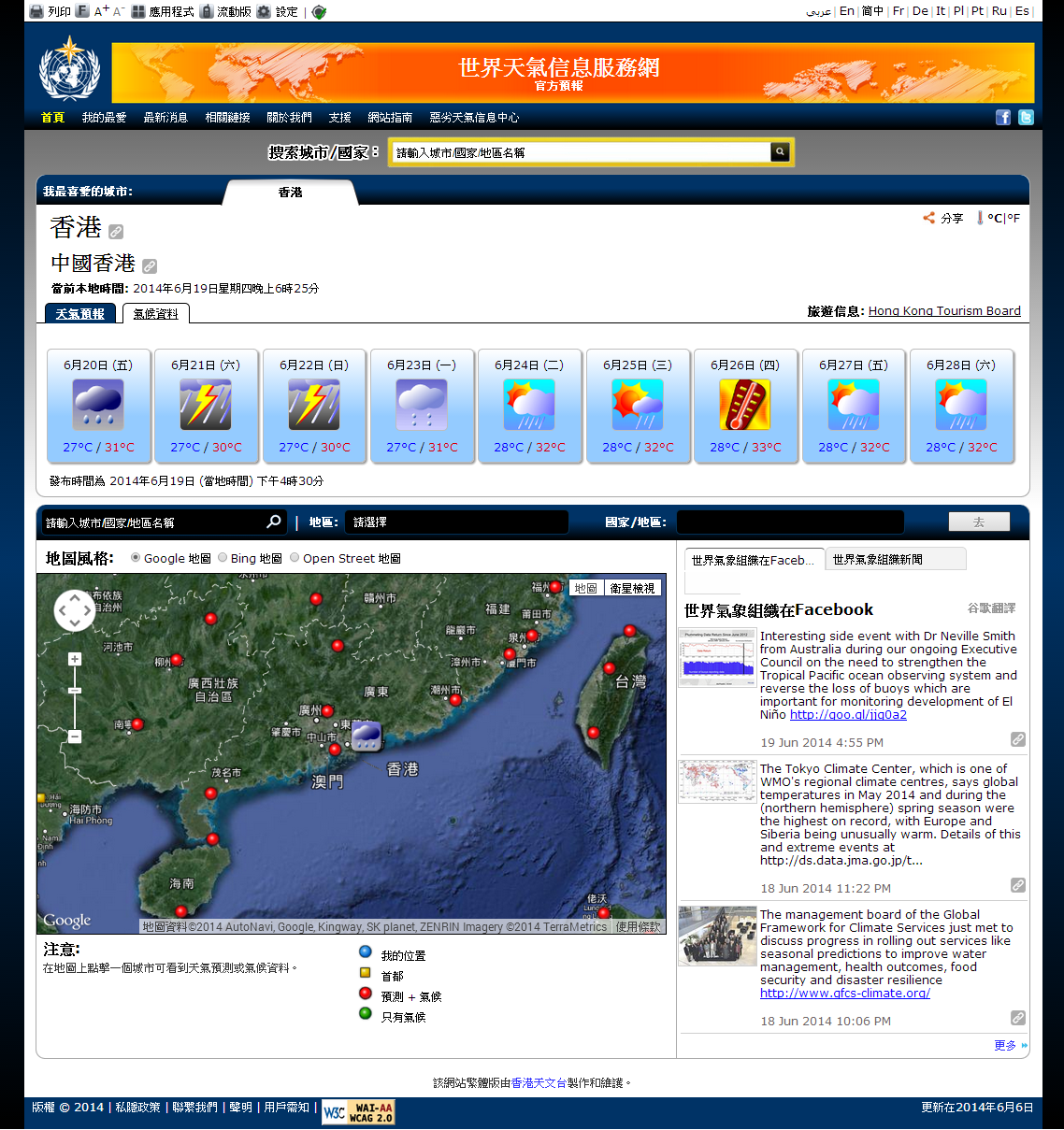 香港天文台今日 (六月二十三日)宣布,为面世超过十年的「世界天气信息服务」网站推出全新版本。「世界天气信息服务」网站 (http://worldweather.wmo.int)由香港天文台代表世界气象组织开发及维持,旨在提供世界各地官方气象及水文部门的权威及可靠的网上天气资料。网站除了换上新颖的用户介面,更整合了最新网上技术包括地理信息系统,提供多项方便用户的新功能,例如容许用户自定主页和最爱城市的列表、分享天气预测予朋友、提供世界气象组织的新闻资讯等等。同时,用户如果使用流动装置浏览网站,网站会自动切换至新增设的流动版本,提供更流畅的用户体验。