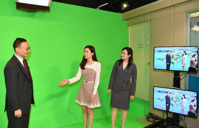 其后,张云正在天文台录影室,与科学主任交谈,了解他们的日常工作,包括制作周一至周六的天气节目及每周的教育节目《气象冷知识》,向市民发放天气预报及气象知识,藉此提升市民的防灾意识。