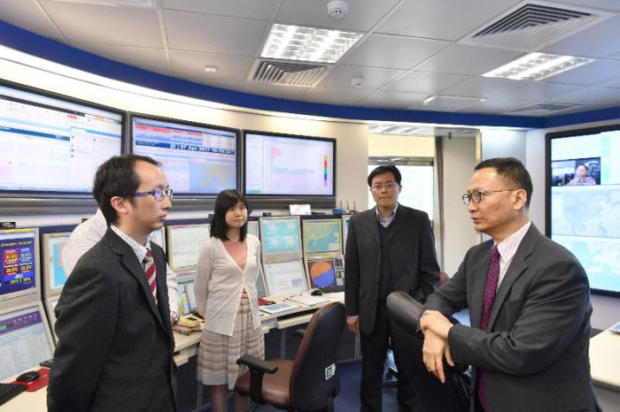 图四 公务员事务局局长张云正(右)今日(四月七日)参观香港天文台天气预测总部,得悉总部负责二十四小时全方位不停监测香港的天气概况,并经不同渠道向公众发放最新的天气资讯。