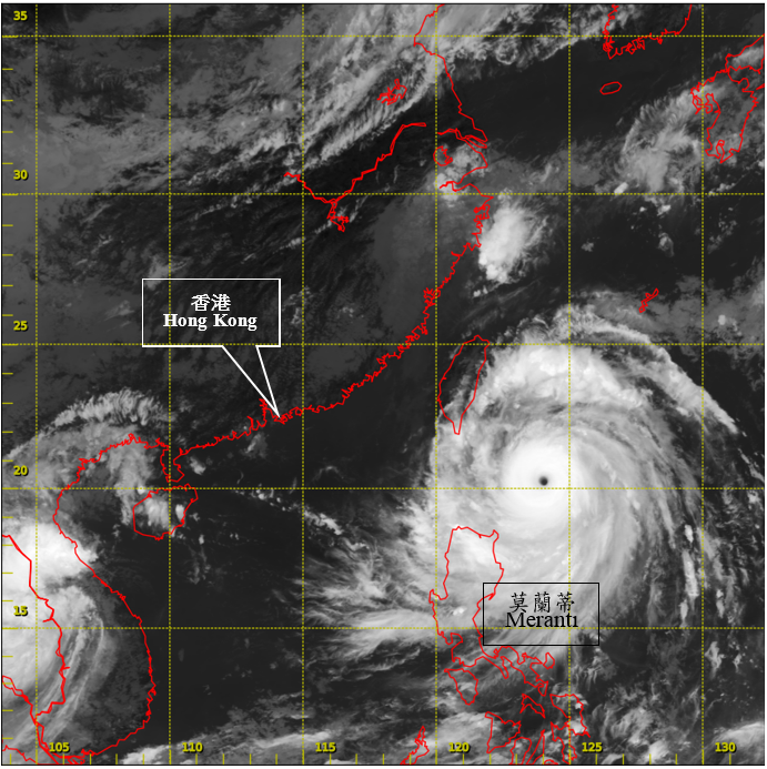 图3.5.2a 二零一六年九月十三日下午2时左右的红外线卫星图片,当时莫兰蒂达到其最高强度,中心附近最高持续风速估计为每小时250公里。