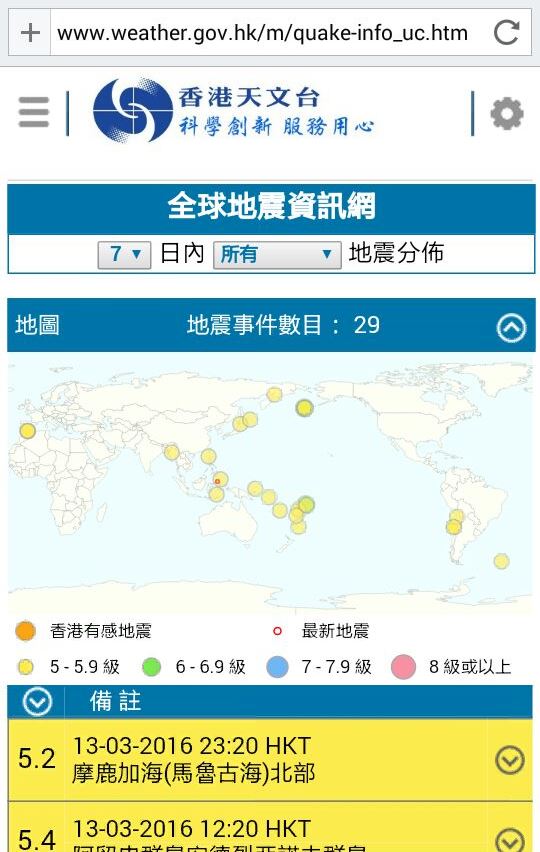 即日起,大家可以不受操作平台限制用手上的流动装置获取实时的全球地震资讯,欢迎浏览「全球地震资讯网」流动版 http://www.weather.gov.hk/m/quake-info_uc.htm 。