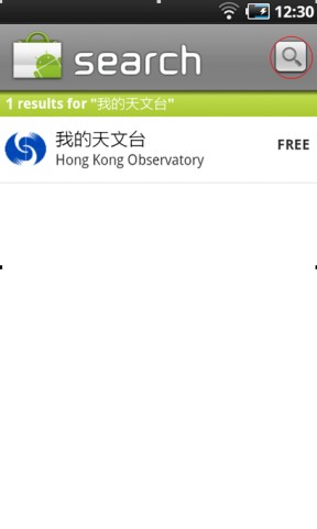 有兴趣人士可使用Android 装置(版本 2.1 或以上)进入 Android Market,于右上方搜寻一栏输入关键字「我的天文台」(图二),便可找到应用程式,以便下载。