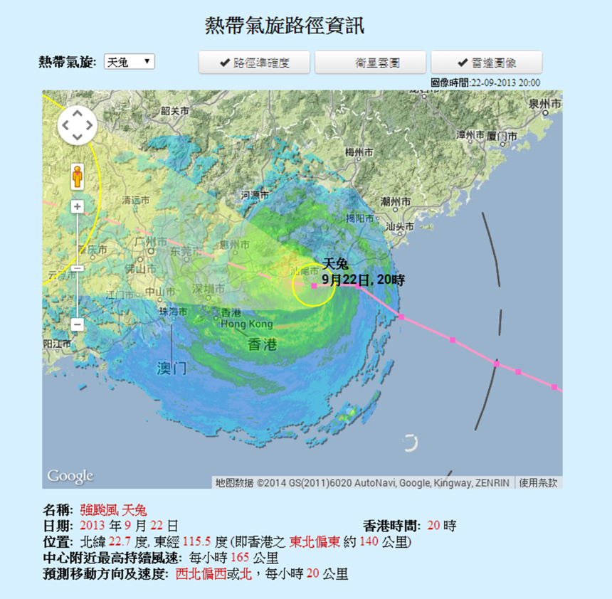 热带气旋路径资讯网页(地理信息系统版)于今天(6月12日)新增了可叠加香港天文台雷达图像的功能。该功能有助用户了解与集结在香港附近的热带气旋相关的雨带所影响的范围。市民可于以下网址浏览加强版网页:http://www.weather.gov.hk/wxinfo/currwx/tc_gis_c.htm。