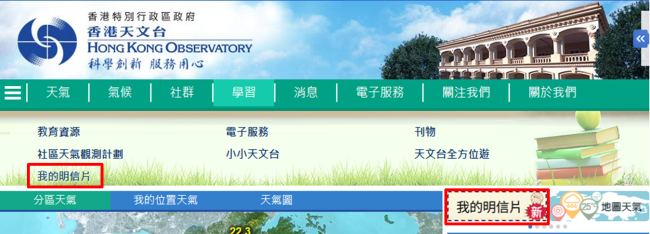 欢迎从天文台主网页上连结到「我的明信片」(图一),或是点击以下网址http://kids.weather.gov.hk/V2/postcard/epostcard_c.htm直接浏览。此网页有效期至2016年1月底,切勿错过!
