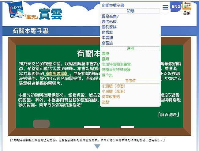 电子云书还包括小测验(分初阶和进阶)以及互动游戏,大家可看看自己对云与特别光学现象的知识。答对小测验全部题目可赢取虚拟奬章,在初推出期间,集齐五个不同奖章可换取纪念品,头十名得奖者更可获赠天文台台长亲笔签名的限量纪念品。纪念品送完即止,大家千万不要错过呀!