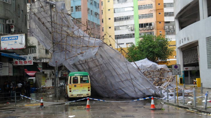 图五 葵涌打砖坪街在台风海鸥袭港期间发生棚架倒塌,一辆货车及小巴受损