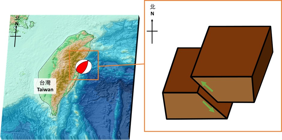 台灣位於菲律賓海板塊和歐亞板塊的複雜聚合區域之間(圖1),屬活躍地震帶。當中在花蓮附近,菲律賓海板塊向西北方向運動並俯衝到歐亞板塊之下,兩塊板塊每年以大約7至8厘米的速度碰撞 [4]。據美國地質調查局(USGS) [5],花蓮地震的震源機制是逆斷層(圖2),可能與歐亞板塊內部的斷層活動有關。