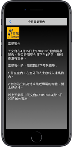 順帶一提,由於雷暴有時只影響香港某些地區,為了讓市民知道是否須要停止、還是可以繼續戶外活動,天文台會在適當時於雷暴警告中說明雷暴影響的區域。此外,市民亦可參考天文台的「閃電位置資訊」及「香港閃電臨近預報」網頁,掌握雷電影響的地區,早作相應的措施。