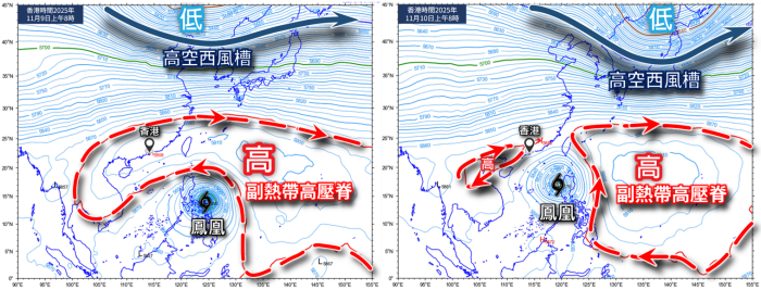 在乾燥的東北季候風影響下,鳳凰於星期二(11月11日)逐漸減弱,並逐漸轉向東北方向移動,橫過南海東北部移向台灣一帶。大家可能好奇為何鳳凰的路徑會突然轉變方向?一般而言,副熱帶高壓脊會引導熱帶氣旋沿著其外圍移動。雖然鳳凰在進入南海前沿著副熱帶高壓脊向偏西方向移動(圖三左),但其後因為副熱帶高壓脊受西風槽「打擊」而分裂成東西兩個單體(圖三右),在鳳凰的北側「開路」,令其路徑在南海東北部發生顯著變化,轉而向北移動。