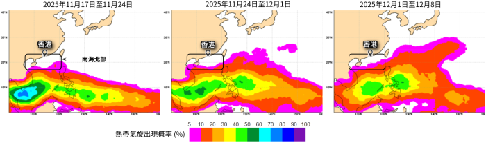 根據現時的中長期電腦模式預測,今年11月餘下時間至12月初南海北部出現熱帶氣旋的機會較低(圖四)。無論如何,天文台會繼續密切監察南海及西北太平洋熱帶氣旋的發展。
