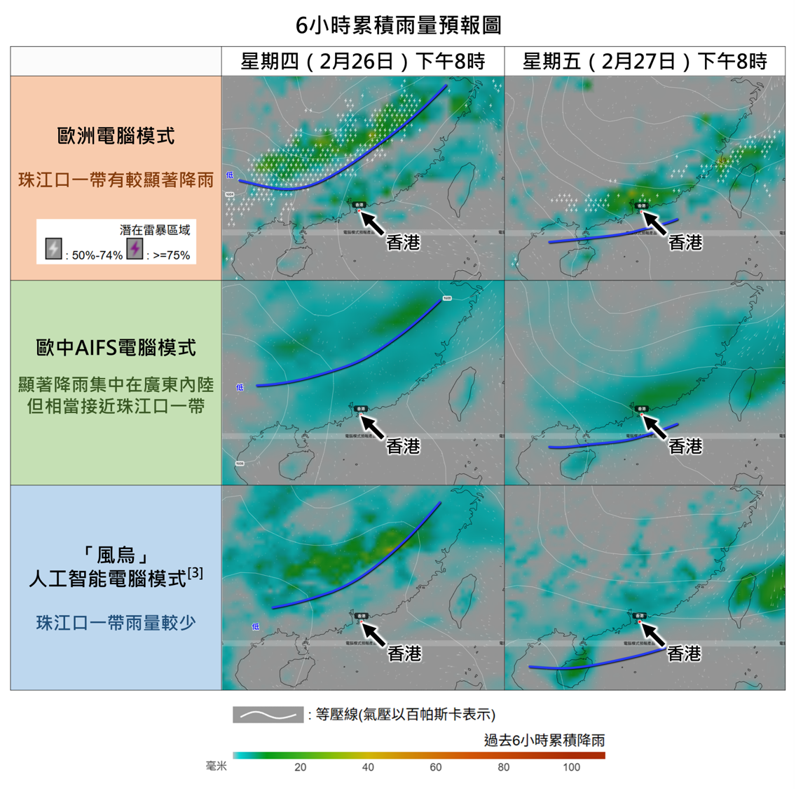 回到本港,隨著東北季候風緩和,風勢轉為微弱,預料今日至週末期間部分時間有陽光及溫暖,最高氣溫回升達26度左右。 一股偏東氣流會在下週初至中期持續影響廣東沿岸,本港雲量將會增多及有微雨,天氣潮濕,星期一風勢較大,日間氣溫稍低。此外,剛過去的年初二(2月18日)適逢二十四節氣中的「雨水」,標誌著雨水增多的時候來臨。根據現時預測,一道低壓槽會在下週後期影響華南,該區會受驟雨甚或雷暴影響,但現時電腦模式預測的雨區範圍、雨量以至是否有雷暴發生仍有分歧(圖二)。隨著華南步入春季,冷暖氣流交替頻繁,大家要留意天氣變化。