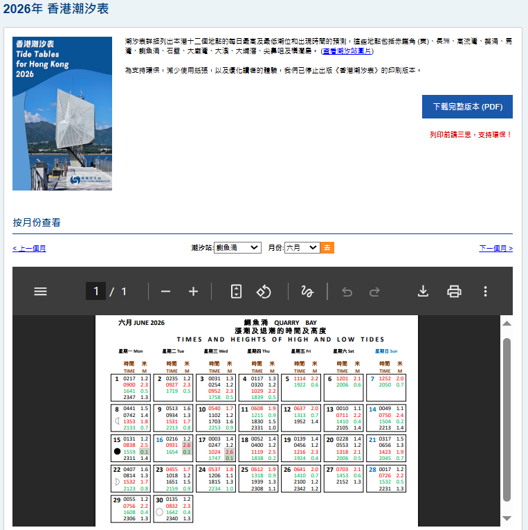 2026年香港潮汐表》的完整版(PDF格式)現已上載到香港天文台網頁,歡迎市民瀏覽及下載。「我的天文台」天氣應用程式亦提供以圖表形式顯示香港潮汐資料。