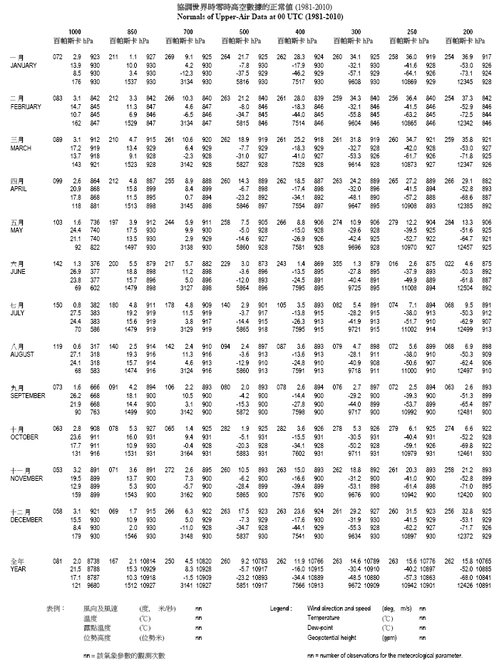 協調世界時零時高空數據的正常值(1) (1981-2010) 協調世界時零時高空數據的正常值(2) (1981-2010)