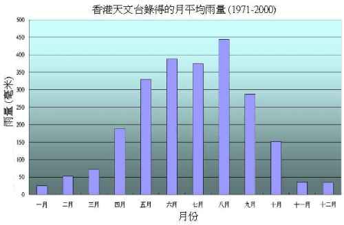 圖三 1971-2000年香港天文台錄得的月平均雨量