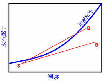 像以下的均衡曲線〈圖一〉,想想氣溫與水汽壓力的關係。如S點,它代表一個氣團,在曲線之下,空氣叫做「不飽和」。如該點在曲線以上,叫做「超飽和」。如該點剛好在曲線上,空氣就是飽和。