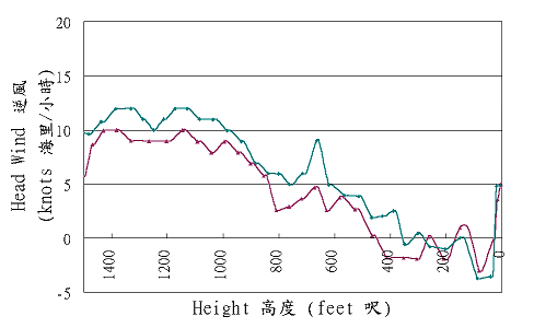 圖六 兩班於13UTC左右着陸的航機錄得的逆風與高度變化