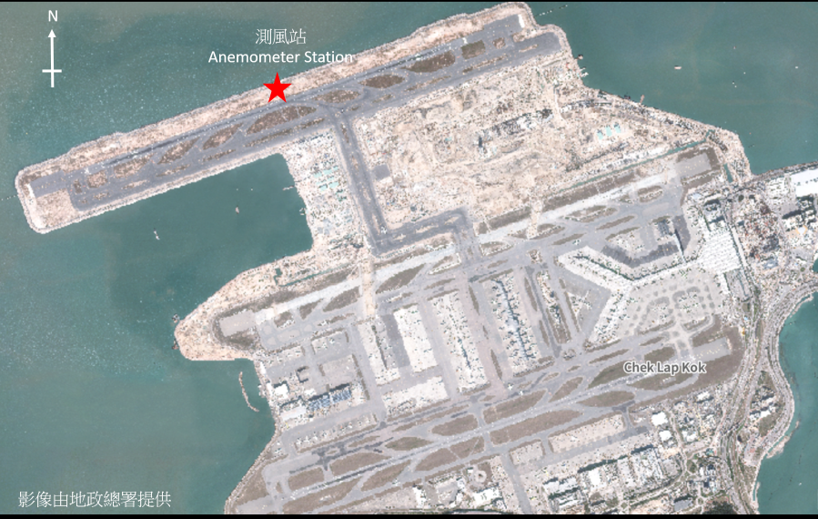 赤鱲角測風站位於赤鱲角的香港國際機場北跑道靠近中間的位置#(測風站的位置請參考以下地圖)。由於該站處於開揚及平坦的填土區,而附近亦沒有高樓大廈,因此該站的開敞程度頗為理想。該站南面為大嶼山的高山。年風玫瑰圖 顯示該站的盛行風。