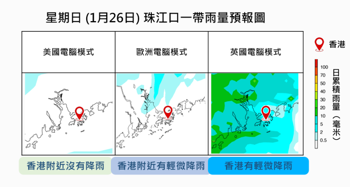 不過,正如「寒潮過三關」所述,北方冷空氣如想入侵本港仍需經過多重考驗,越過南嶺及本地山脈。除此之外,若屆時影響本港的偏東氣流較預期更強,冷鋒南下的速度可能會較慢,令北風到達沿岸地區和氣溫下降的時間有所推遲。此外,按照現時各電腦模式預測,冷鋒過境時有較大可能會伴隨降雨,降雨會帶來蒸發冷卻效應,氣溫會有較大跌幅。但不同電腦模式對於降雨預測仍有分歧,若降雨較為持續,下星期一的氣溫有機會更低。