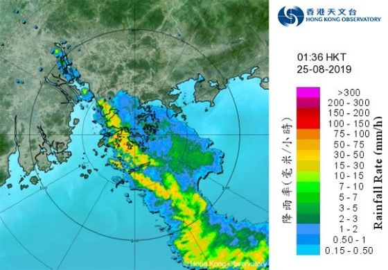 2019年8月25日雷達圖像顯示,本港受一道強雷雨帶影響