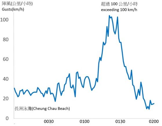 2019年8月25日凌晨長洲泳灘風速時間序列圖顯示,陣風風速曾超過每小時100公里。